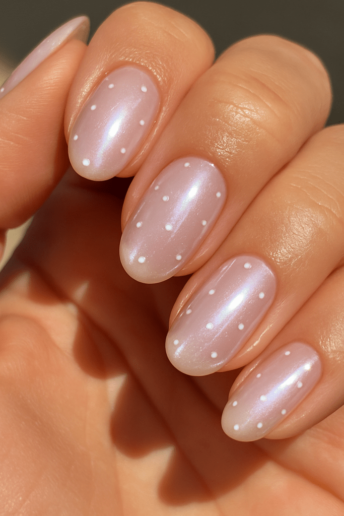 For a romantic and elegant take, a sheer pink base with delicate white dots creates a refined look. The subtle shimmer in the pink catches the light beautifully, while the fine dots look closer to pearls than playful spots. This makes the design perfect for formal occasions, weddings, or any event where you want nails that feel feminine and delicate. It balances minimalism with detail, ensuring the nails never look overdone. Pair it with pastel outfits or soft makeup for a cohesive look, or let it act as a gentle contrast to darker fashion choices.