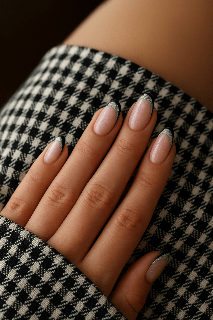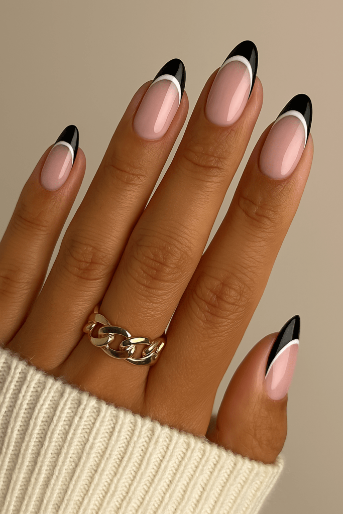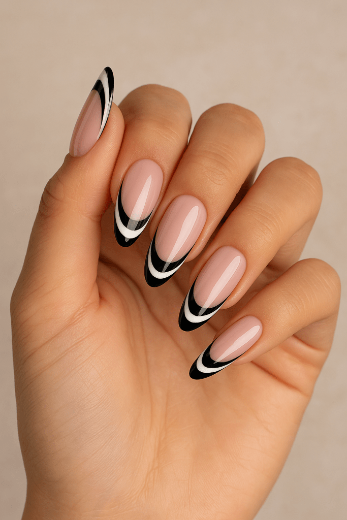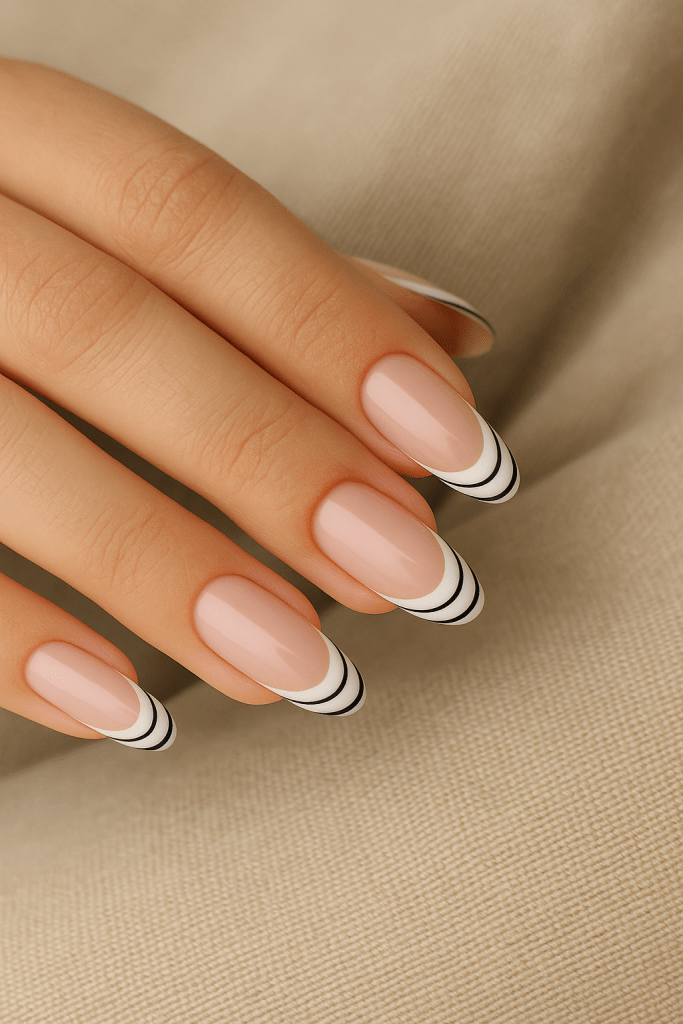 This is not the kind of French you forget after scrolling past it once. The look stays in your mind because of its sharp balance. The nude base keeps the manicure neutral, the wide white section adds brightness, and the black lines cut through with definition. It is polished enough for an event, but playful enough to wear daily.