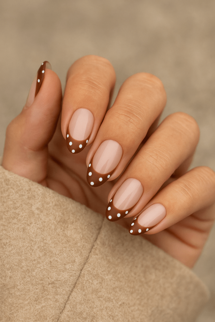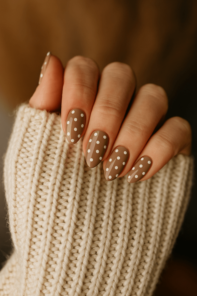 A latte brown base with clean white dots feels softer and more wearable. This design leans into cozy, autumn-ready tones while keeping things playful. The white dots stand out against the neutral background, creating a clean and fresh look without being loud. It is the type of manicure that works for daily life: coffee runs, office outfits, and casual weekends. Pair it with cream sweaters or beige coats to highlight the warm undertones of the brown. The design is subtle, yet it will not go unnoticed.