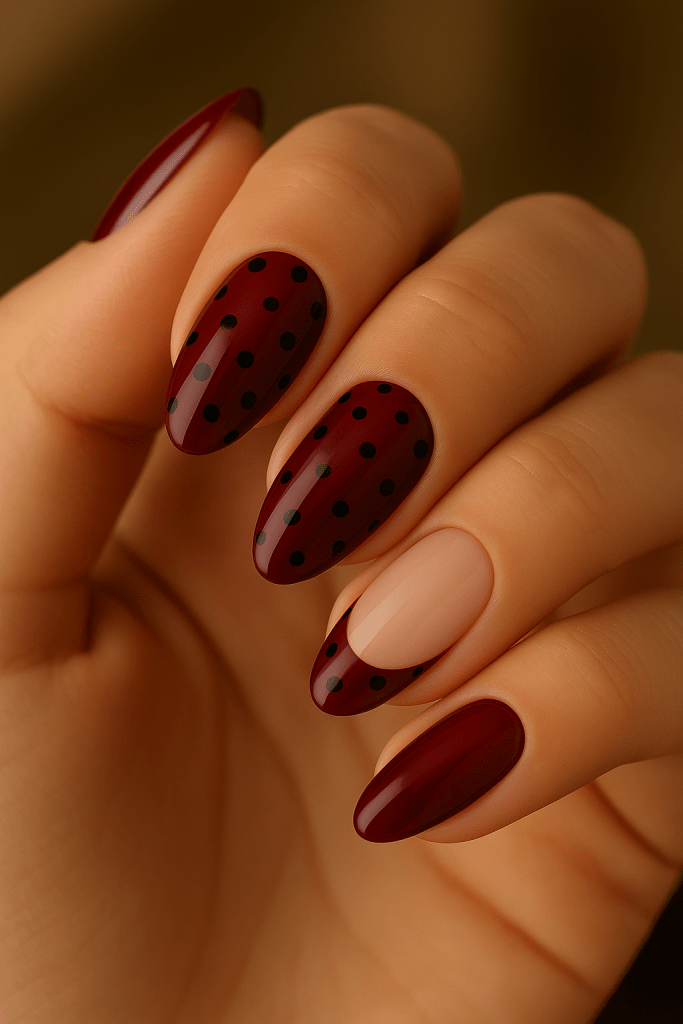 This version combines a deep burgundy base with glossy black dots. The result is bold, moody, and full of character. Burgundy has always been a fall favorite, and the addition of dots prevents the color from looking flat or heavy. The pattern breaks up the depth, giving the nails a graphic accent while keeping them sleek. Wear this for evening plans, special dinners, or whenever you want your manicure to feel like an accessory on its own. Paired with gold jewelry or a dark lip, the effect is striking.