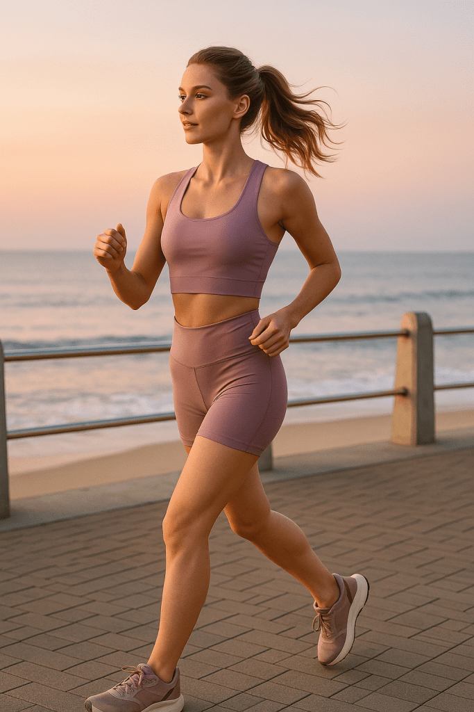 Soft light, soft tones, strong energy. This muted mauve running set captures the beauty of movement at golden hour. The high-waisted shorts and matching sports bra create a clean, minimal silhouette that feels both feminine and athletic. The dusty pink sneakers tie the look together without trying too hard. Perfect for beachside runs, evening walks, or just soaking in that peaceful post-workout glow. Simple, graceful, and full of quiet strength.