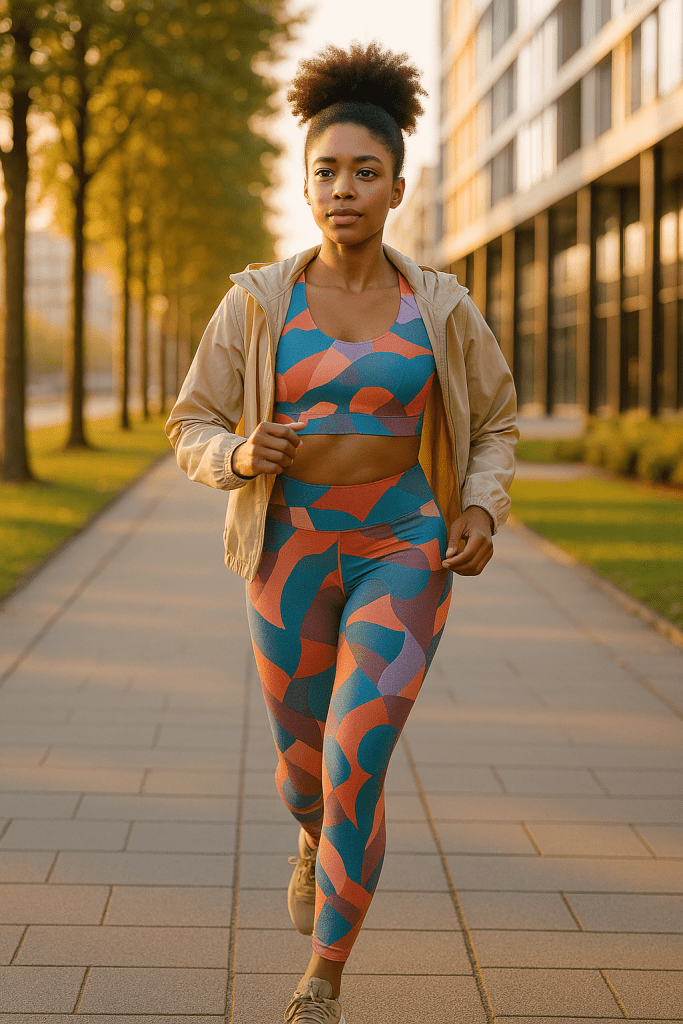 Bold, bright, and full of life. This patterned set mixes coral, teal, and muted purple in a way that instantly lifts your mood. Paired with a light beige jacket and neutral sneakers, it feels both playful and balanced. The soft morning light brings out the colors beautifully, making this look perfect for those who love a fun twist on activewear without giving up a clean, modern vibe.
