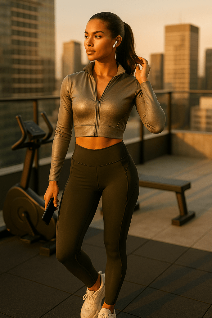 This look was made for golden light. The sleek metallic beige zip top and deep olive sculpt leggings hit that perfect balance between sporty and sophisticated. It’s the kind of outfit that makes you want to move, even if it’s just for the post-workout rooftop view. Add your earbuds, tie your ponytail high, and let the city glow match your energy.