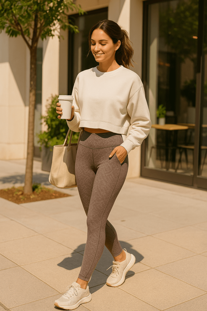 Some outfits are made for movement, others for that peaceful post-workout moment, this one does both. The soft brown sculpt leggings and cropped cream sweatshirt create an effortlessly relaxed silhouette that still looks polished enough to wear outside the gym. It’s the kind of outfit you throw on for a morning pilates class, then end up grabbing coffee and strolling through the city because you just feel good in it. Comfortable, minimal, and quietly elevated, it’s proof that sporty doesn’t have to mean casual.