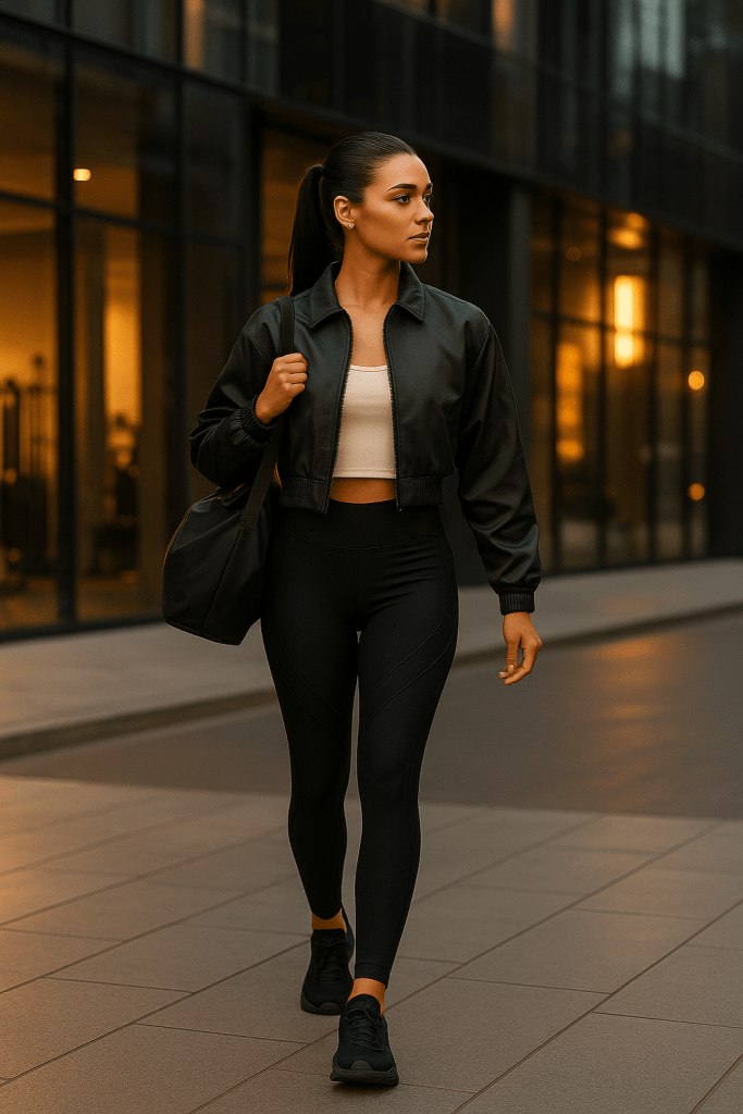 When your gym outfit doubles as your evening street style, you know you’ve nailed the balance. The all-black sculpt leggings and cropped leather-effect jacket create that bold, urban look that feels effortlessly confident. The ivory sports bra softens the vibe just enough to keep it wearable, while the structured gym bag ties it all together. Perfect for late workouts, evening walks, or just that “I’ve-got-places-to-be” kind of energy. It’s minimal, powerful, and perfectly polished.