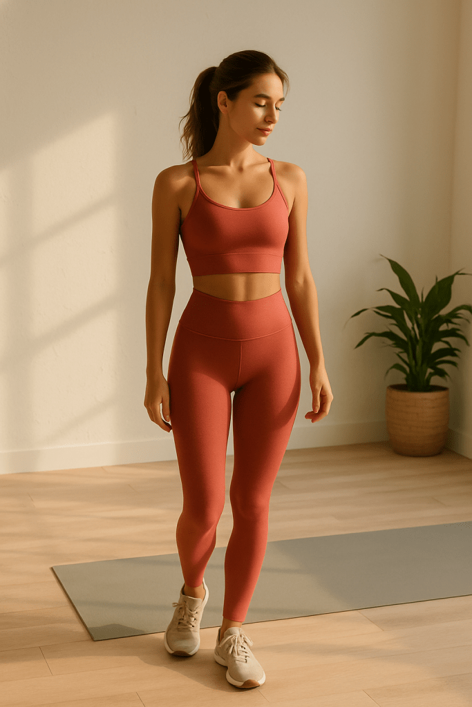 Soft light, calm energy, and a set that moves with you. This muted terracotta workout look feels like a quiet reset, something you’d wear for a slow morning yoga session or a mindful stretch before the day starts. The warm tone flatters every skin tone, while the seamless fit gives both comfort and confidence. It’s simple, but it radiates balance and ease, like that moment when the first sunlight hits your mat and everything just feels right.