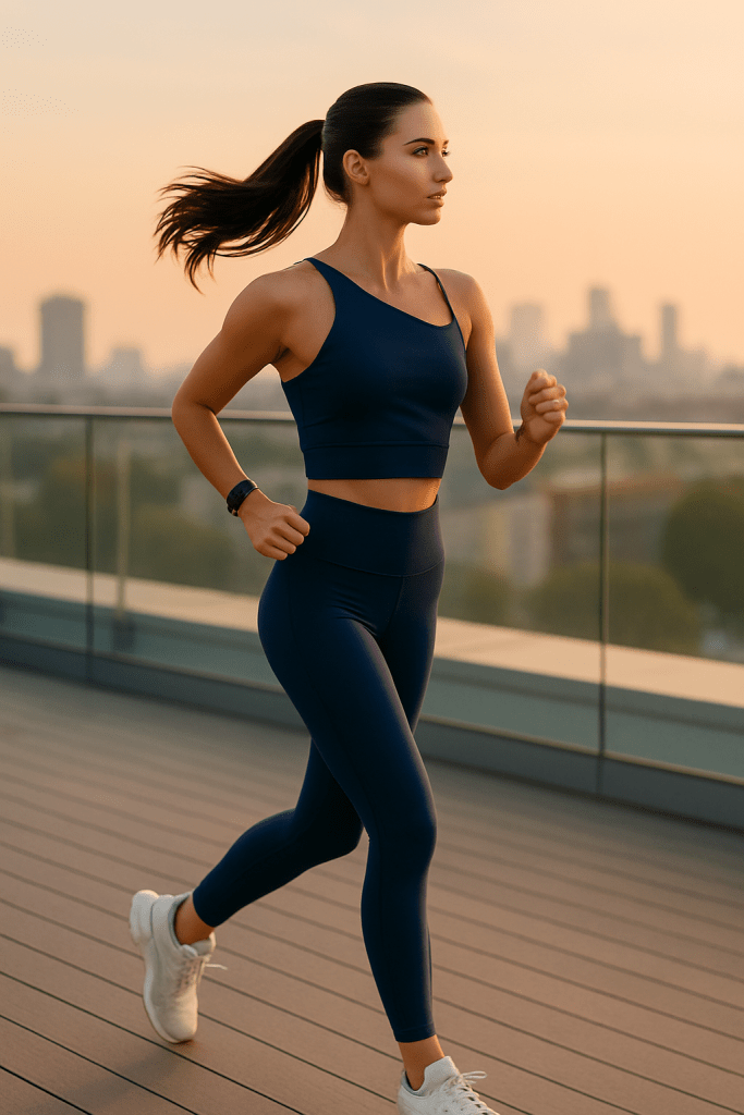 Simple, sleek, and strong. This charcoal grey running set proves that minimalism can still make a statement. The cropped long-sleeve top and sculpting leggings create a clean silhouette that moves effortlessly with the body. Paired with light grey sneakers and a morning skyline, it’s the perfect outfit for city runs or early workouts before the world wakes up. Confident, timeless, and quietly powerful.